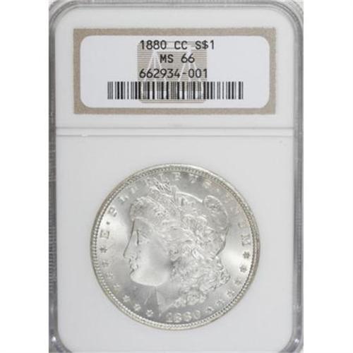 <B>1880-CC $1 MS66 NGC.</B></I> This 1880-CC Morgan dollar displays a slanted top arrow feather, meaning that it is the Reverse of 1879 variety. While this variety is more plentiful than the 1880-CC with a parallel top arrow feather (Reverse of 1878), many surviving specimens are extensively bagmarked, making it difficult to locate an example with good eye appeal. The Premium Gem coin in this lot fits the bill. Its radiantly lustrous surfaces are refreshingly clean and smooth. Whispers of incipient light tan-gold color are slightly more noticeable on the reverse. The design elements are generally well impressed, save for the usually seen softness in the hair strands at Liberty's ear.<BR><I>From The Silver Fox Collection.</B></I><BR><BR><b>Shipping:</b> Coins & Currency (<a target="_blank" href="http://www.heritageauctions.com/common/shipping.php">view shipping information</a>)
