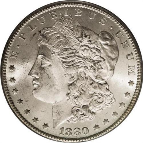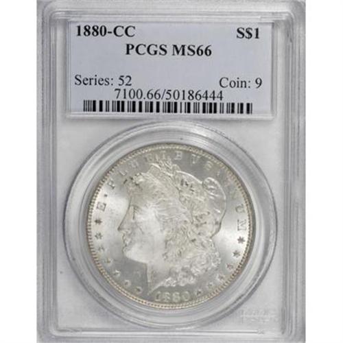 <B>1880-CC $1 MS66 PCGS.</B></I> This Premium Gem example is the Reverse of 1879, with slanting top arrow feather and rounded eagle's breast. Wisps of faint tan-gold color adhere to highly lustrous surfaces that exhibit well impressed design elements. A few grade-consistent luster grazes on the cheek and neck are not at all bothersome.<BR><BR><B>Coin Engraver:</B> George T. Morgan<BR><BR><b>Shipping:</b> Coins & Currency (<a target="_blank" href="http://www.heritageauctions.com/common/shipping.php">view shipping information</a>)