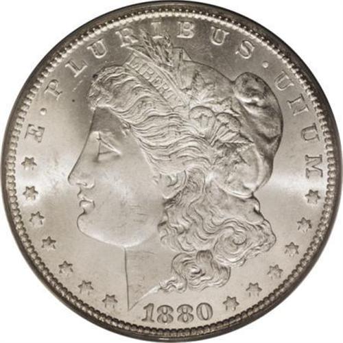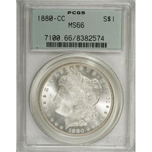 <B>1880-CC $1 8 Over High 7 MS66 PCGS.</B></I> VAM-5. A Top 100 Variety. The overdate feature and VAM are undesignated on the PCGS green label, but there is clear evidence of the crossbar and upright of a high underdigit 7 within the second 8 of the date; just a slight portion of the base of the 7 shows beneath the 8. The radiantly lustrous surfaces of this Premium Gem display just the slightest hint of light tan speckles under high magnification. Partially prooflike fields establish mild contrast with the well struck motifs. A few minor luster grazes are consistent with the grade designation, and there are some light obverse as-made roller marks. Population: 58 in 66 8 Over High 7, 5 finer (7/07).<BR><I>From The Arnold & Harriet Collection, Part Two.</B></I><BR><BR><B>Coin Engraver:</B> George T. Morgan<BR><BR><b>Shipping:</b> Coins & Currency (<a target="_blank" href="http://www.heritageauctions.com/common/shipping.php">view shipping information</a>)