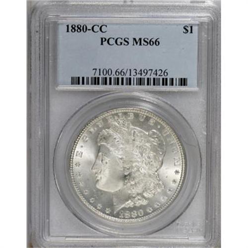 <B>1880-CC $1 MS66 PCGS.</B></I> This original and exemplary Premium Gem features light chestnut-gold toning. The fields are remarkably void of contact, and the portrait has only trivial grazes. A small dash is present beneath the second 8, as often seen on this popular Carson City issue. The centers display faint mint-made roller marks.<BR><BR><B>Coin Engraver:</B> George T. Morgan<BR><BR><b>Shipping:</b> Coins & Currency (<a target="_blank" href="http://www.heritageauctions.com/common/shipping.php">view shipping information</a>)