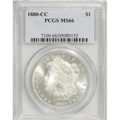 <B>1880-CC $1 MS66 PCGS.</B></I> Reverse of 1879. This variety is attributed by its rounded eagle's breast and a slanted top arrow feather. Intense mint frost covers the essentially untoned silver-white surfaces, and the striking details are generally bold, if a trifle weak at the centers. Faint luster grazes are noted on the obverse, and a few small contact marks on the reverse. <BR><BR><B>Coin Engraver:</B> George T. Morgan<BR><BR><b>Shipping:</b> Coins & Currency (<a target="_blank" href="http://www.heritageauctions.com/common/shipping.php">view shipping information</a>)