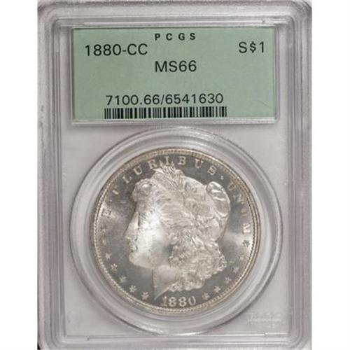 <B>1880-CC $1 MS66 PCGS.</B></I> The fields of this Premium Gem illustrate semi-prooflike tendencies, establishing mild contrast with the satiny motifs. The strike is slightly above average for the issue, exhibiting partial definition in the hair at Liberty's ear. The untoned surfaces are impeccably preserved. Certified in a green label holder.<BR><I>From The Oxford Collection.</B></I><BR><BR><B>Coin Engraver:</B> George T. Morgan<BR><BR><b>Shipping:</b> Coins & Currency (<a target="_blank" href="http://www.heritageauctions.com/common/shipping.php">view shipping information</a>)