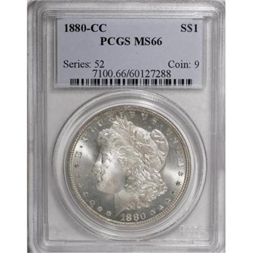 <B>1880-CC $1 MS66 PCGS.</B></I> VAM-3A. Light die chips near the mintmark are reminiscent of the "Capped Die" 1879-CC VAM-3. Lustrous and lightly toned with a magnificently preserved obverse and only trivial reverse contact. The 1880-CC is significantly scarcer than its 1882-CC through 1884-CC successors. Struck from boldly clashed dies.<BR><BR><B>Coin Engraver:</B> George T. Morgan<BR><BR><b>Shipping:</b> Coins & Currency (<a target="_blank" href="http://www.heritageauctions.com/common/shipping.php">view shipping information</a>)