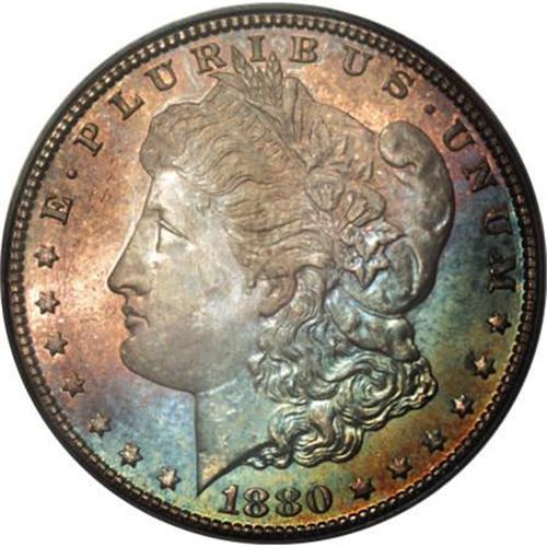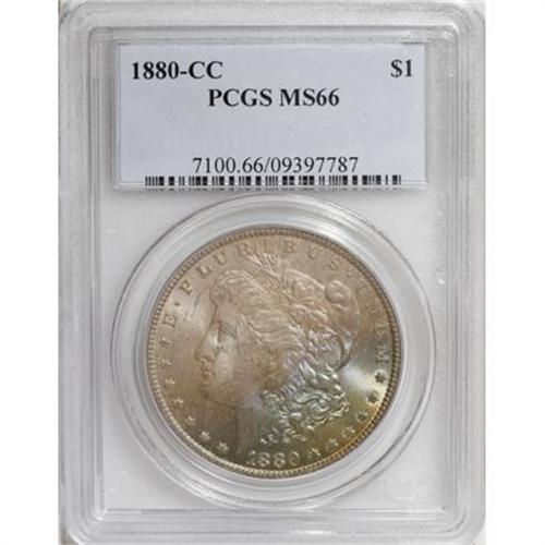 <B>1880-CC $1 MS66 PCGS.</B></I> The obverse of this Premium Gem is toned in lineal golden-brown, lilac, sky-blue, sea-green, and yellow-rose. In contradiction, the reverse is entirely brilliant and untoned. Both sides of this beauty have sharp design features and frosty surfaces. PCGS has only certified 23 finer pieces.<BR><BR><B>Coin Engraver:</B> George T. Morgan<BR><BR><b>Shipping:</b> Coins & Currency (<a target="_blank" href="http://www.heritageauctions.com/common/shipping.php">view shipping information</a>)