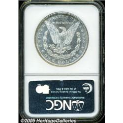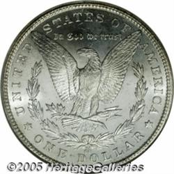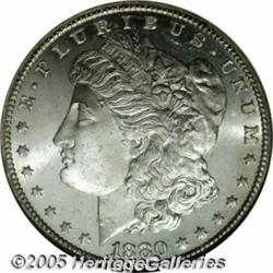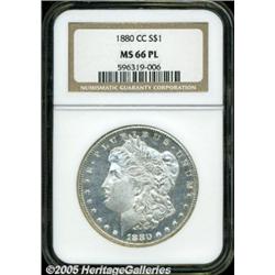 <B>1880-CC<img border='0' src='http://www.heritagecoins.com/images/star.gif' width=10 height=10>$1 MS66 Prooflike NGC.</B></I> Frosty over the devices, the surfaces are appreciably reflective in the fields. A minimally marked, silver-white example. A little strike softness shows at the central regions.