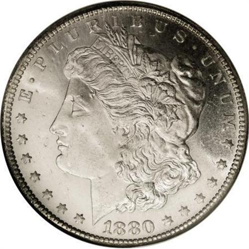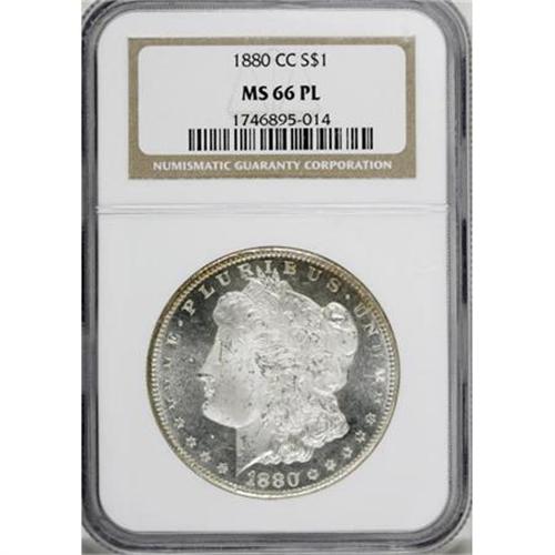 <B>1880-CC $1 MS66 Prooflike NGC.</B></I> The 1880-CC dollar in this lot is the more usually seen Reverse of 1879, identified by the slanted top arrow feather and convex eagle's breast. Prooflike fields establish excellent contrast with the frosted motifs. Wisps of light color are barely discernible at the peripheries, and the design elements are well struck, including good definition in the hair at Liberty's ear and the breast feathers. A few faint grazes on the portrait do not detract. Census: 18 in 66 Prooflike, 1 finer (10/07).<BR><BR><B>Coin Engraver:</B> George T. Morgan<BR><BR><b>Shipping:</b> Coins & Currency (<a target="_blank" href="http://www.heritageauctions.com/common/shipping.php">view shipping information</a>)