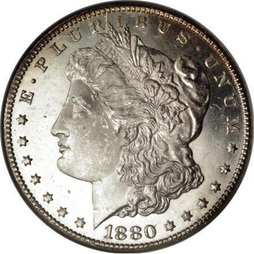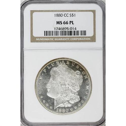<B>1880-CC $1 MS66 Prooflike NGC.</B></I> An attractive, moderately reflective representative from one of the more common Reverse of 1879 die pairings. Decisively struck devices are richly frosted, and the delicate silver-gray patina that drapes the mirrors shows glimmers of gold-orange at the rims. Exquisitely preserved and appealing in all respects. Census: 18 in 66 Prooflike, 1 finer (3/08).<BR><BR><B>Coin Engraver:</B> George T. Morgan<BR><BR><b>Shipping:</b> Coins & Currency (<a target="_blank" href="http://www.heritageauctions.com/common/shipping.php">view shipping information</a>)