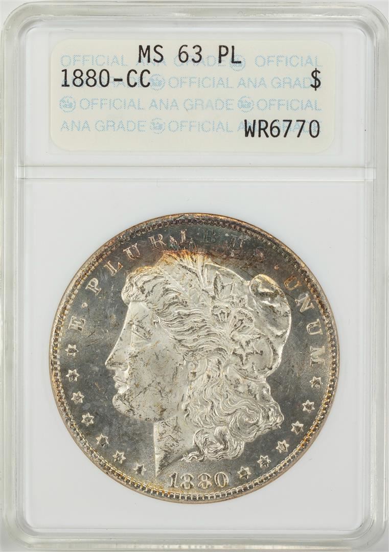 One 1880-CC $1 Morgan Silver Dollar Coin ANACS MS63 PL Nice Toning. ANACS Certified.
