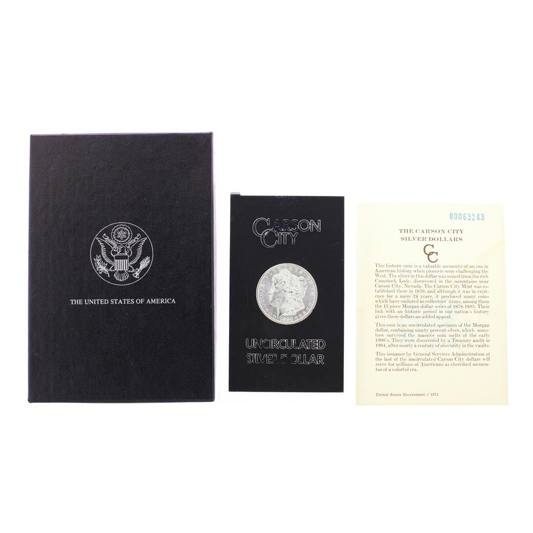 One 1880-CC $1 Morgan Silver Dollar Coin GSA Hoard Uncirculated with Box & COA.