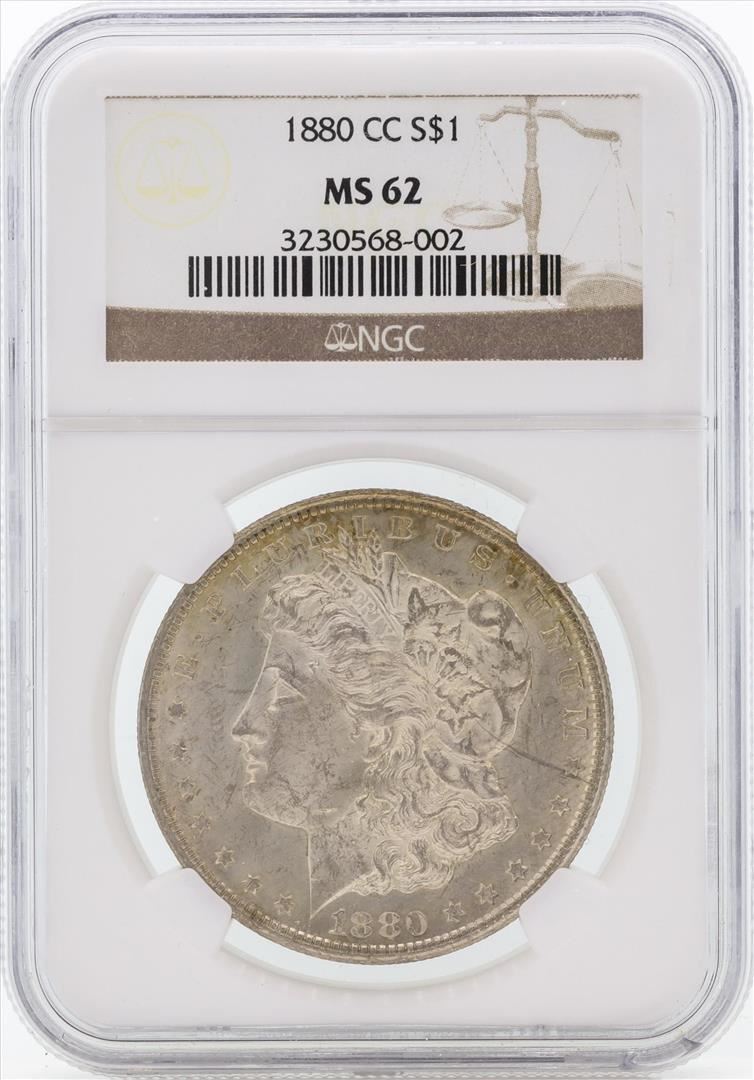 One 1880-CC $1 Morgan Silver Dollar Coin NGC MS62. NGC Certified.