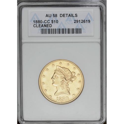 <B>1880-CC $10 --Cleaned--ANACS. AU58 Details.</B></I> Variety 1-A. A shiny yellow-gold piece, typically struck with hints of orange on the lightly rubbed devices. The original luster remains strong at the periphery.<BR><BR><b>Shipping:</b> Coin/Currency (<a target="_blank" href="http://www.heritageauctions.com/common/shipping.php">view shipping information</a>)