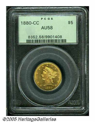 <B>1880-CC<$5> AU58 PCGS.</B></I> This is an extremely important opportunity for the specialist to acquire a lovely example of this scarce date. Both sides are fully lustrous and sharply defined. There are only a few tiny surface marks, along with a couple small dark stains on the reverse. The connoisseur will recognize this as a top-quality example for the grade, and one of the finest available examples. Population: 11 in 58, 6 finer (5/05).<BR><I>From The Stig Ericsson Collection.</B></I>