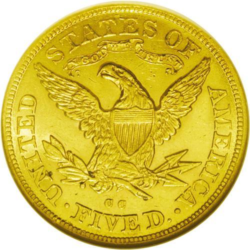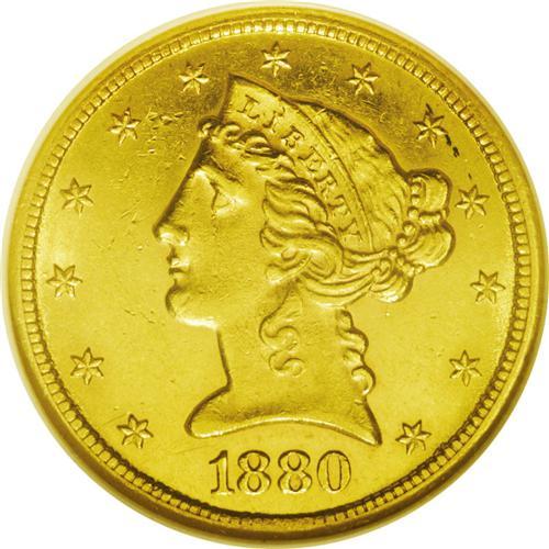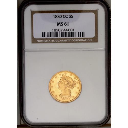 <B>1880-CC<$5> MS61 NGC.</B></I> Variety 2-C. This variety is distinguished by a series of raised mint-made die marks below the eye of Liberty and the position of the second C in the mintmark over the right serif of the V in FIVE. The 1880-CC is an available CC half eagle as a well circulated specimen, but it is surprisingly scarce in this grade. This particular piece is probably a lower-Condition Census coin. The lustrous yellow-golden surfaces are lightly abraded with a few small but individually insignificant marks on the face of Liberty. Well struck throughout. Census: 9 in 61, 1 finer (5/06).