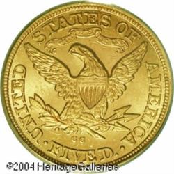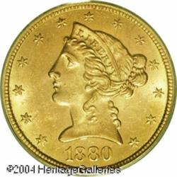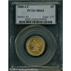 1880-CC $5 MS63 PCGS. The top coins listed on the <B>1880-CC $5 MS63 PCGS.</B></I> The top coins listed on the Condition Census for this issue are two MS62 pieces. This is the finest example certified by either of the major services, and as such it stands as the finest known of this popular Carson City issue. While not especially rare in the absolute sense with 51,107 pieces struck and some 275-325 pieces believed known in all grades, the 1880-CC is unknown above MS62 except for this single coin. Sharply defined in all areas, the surfaces exude the usual frosted mint luster common to Carson City products, and the coin is unquestionably original with lovely, light pinkish-golden patina over each side. Identifiable in the future by a shallow planchet flake out of the field next to star 2 on the obverse. <BR><BR><B>Important notice:</B> Heritage usually auctions material at the rate of 200-250 lots per hour. On some occasions eBay Live bid software or the Internet may not be able to keep up with the pace of the auction. We recommend placing a realistic absentee bid now as insurance to avoid disappointment. Occasionally the auctioneer may eliminate or reject an eBay Live bid, and the auctioneer may also reopen a lot after the close of the eBay live bidding (usually because we missed an audience bid), and may reject your bid even if it shows you as the winning bidder. By bidding via eBay Live, you agree that Heritage may award the lot to another bidder at its sole discretion under the circumstances described above or any other reasonable circumstances. Since eBay bids are not shown to us until we open the lot on the floor, we treat those bids just like floor bids. In most cases the floor responds before the eBay bid is presented to us, due to Internet lag time, so for consistency we have made it a policy that floor bids are always considered first over tie eBay live bids. Also please note that all Heritage lots purchased through eBay Live carry a 20% Buyer's Premium. Please make sure you read the Terms and Conditions before you bid. This lot is being auctioned in conjunction with a live floor auction by Heritage Galleries & Auctioneers. All final auction and invoice information will be supplied by Heritage Galleries & Auctioneers, and all other information should be considered preliminary. Lot:6663