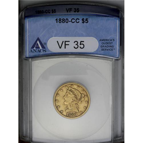 <B>1880-CC<$5> VF35 ANACS.</B></I> Choice VF with even mustard-gold color and consistent wear over the devices. One of the more available examples of Carson City gold with 51,017 pieces struck.