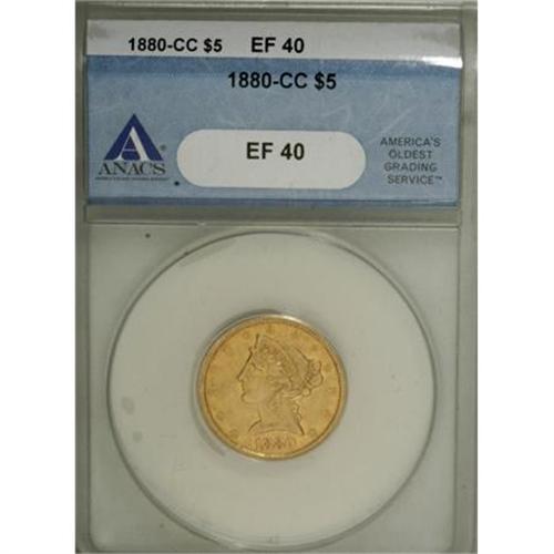 <B>1880-CC $5 XF40 ANACS.</B></I> Well struck and satiny, with khaki-green color and strong glints of luster near the peripheral devices. A small milling mark is observed on Liberty's eyebrow, and a few wispy hairlines and pinscratches are noted in the fields. <BR><I>Ex: The George N. Polis, M.D. Collection (Bowers and Merena, 6/91), lot 3083. </B></I><BR><I>From The John Stimson, Sr. Collection, Part Two.</B></I><BR><BR><B>Coin Engraver:</B> Christian Gobrecht<BR><BR><b>Shipping:</b> Coins & Currency (<a target="_blank" href="http://www.heritageauctions.com/common/shipping.php">view shipping information</a>)