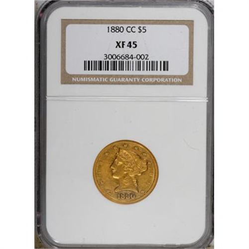 <B>1880-CC $5 XF45 NGC.</B></I> Pockets of luminous luster outline the legends and stars of this yellow-gold Carson City five. Marks are insignificant, but the strike shows some softness on Liberty's hair and the eagle's neck and fletchings.<BR><BR><b>Shipping:</b> Coins & Currency (<a target="_blank" href="http://www.heritageauctions.com/common/shipping.php">view shipping information</a>)