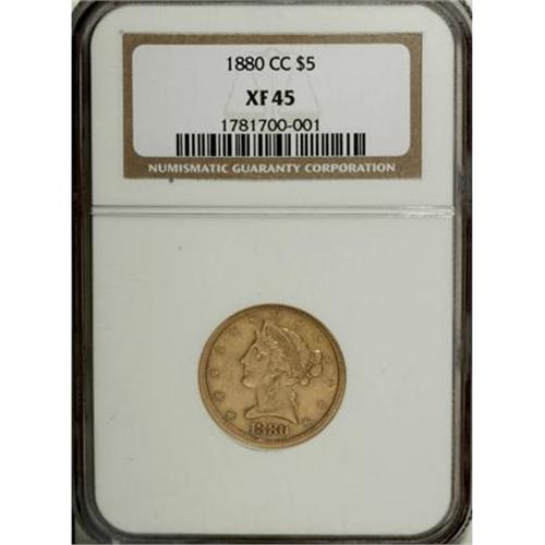 <B>1880-CC $5 XF45 NGC.</B></I> This is an appealing Choice XF example that shows moderate wear for the grade, and few marks on either side. One of the more easily available Carson City half eagle issues. <BR><BR><B>Coin Engraver:</B> Christian Gobrecht<BR><BR><b>Shipping:</b> Coins & Currency (<a target="_blank" href="http://www.heritageauctions.com/common/shipping.php">view shipping information</a>)