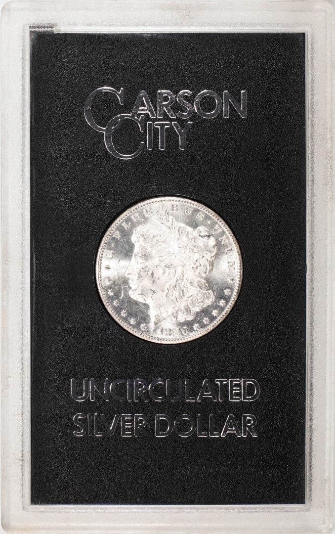 One 1880-CC 8/7 High 7 Rev of 79 $1 Morgan Silver Dollar Coin GSA Uncirculated Box & COA.