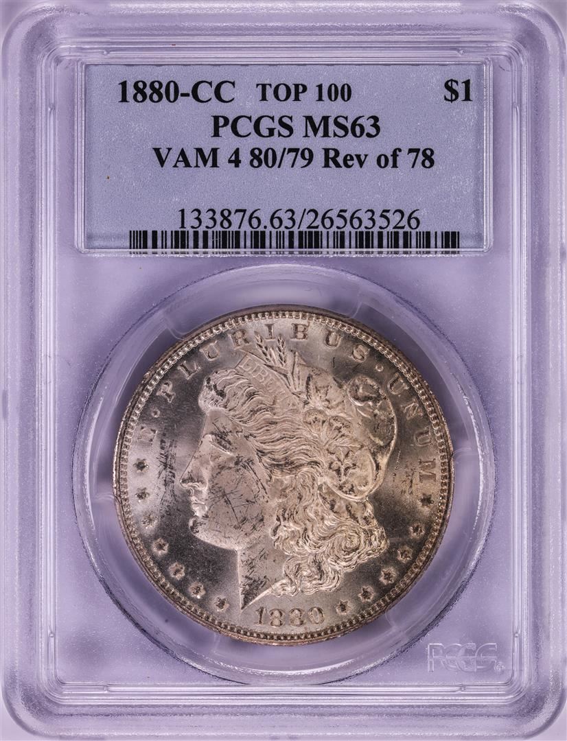 One 1880-CC 80/79 Rev of 78 VAM-4 Top 100 $1 Morgan Silver Dollar Coin PCGS MS63. PCGS Graded.