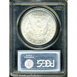 <B>1880-CC<img border='0' src='http://www.heritagecoins.com/images/star.gif' width=10 height=10>$1 MS65 PCGS.</B></I> Generally well detailed, save for typical weakness above Liberty's ear, and on the eagle's breast, this nevertheless pleasing Gem also displays lovely combination luster (satiny and frosty), a coating of silver-gray patina over both sides, a couple of faint reddish toning streaks in the upper left obverse field, and minimal marks even for a Gem. An interesting planchet streak (as struck) bisects the eagle's breast. Lot:9965