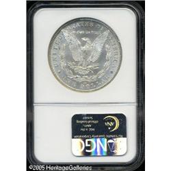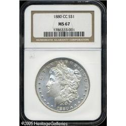 <B>1880-CC<img border='0' src='http://www.heritagecoins.com/images/star.gif' width=10 height=10>$1 MS67 NGC.</B></I> Less than half a million 1880-CC dollars were struck, as 96,000 coins were melted when the Assay Commission determined that a number of dollars were of insufficient fineness. Generally available in Gem condition, primarily due to the large number of GSA examples of this issue that dropped onto the market thirty years ago, the number of better-than-Gem coins drops sharply. Only six other pieces have been so graded by NGC with none finer at either service (1/05). This is a sparkling, brilliant example that is relatively free from the abrasions that usually plague Carson City dollars. Fully struck in all areas and brilliant throughout.<BR><I>From The Banks Collection.</B></I> Lot:9972