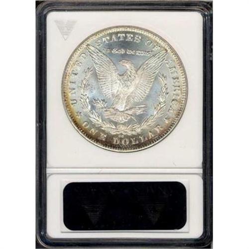 <b>1880-CC Morgan Dollar. Reverse of 1879. ANACS graded MS64.</b> A few light bagmarks on the facial features. The surfaces are a heavy silvery bright, with nothing subtle about the luster, rather brighter luster than average plus a thin line of gold toning at the rim. The Reverse of 1879 has a rounded or "convex" chest on the eagle, while the top arrow feather is slanted <b>(PCGS # 7100)</b>