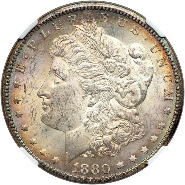 1880-CC Morgan Dollar. Reverse of 1879. NGC graded MS-63. Nice golden toning on the obverse plus cascading frosty luster throughout (PCGS # 7100) .