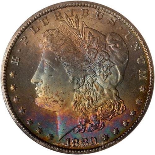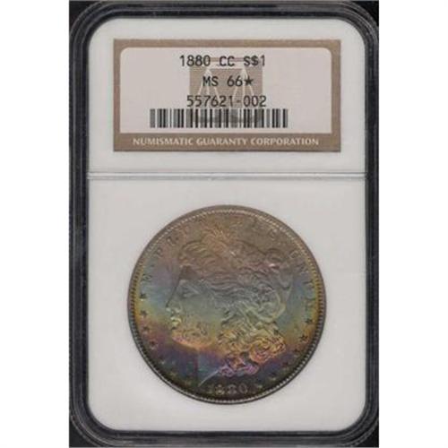<b>1880-CC Morgan Dollar. Reverse of 1879. NGC graded MS66 Star Designation for Eye Appeal.</b> Exquisite multicolor toning whose shades include most of the colors in the rainbow, with just a perfect, balanced, and grand appearance. How could it get better than this! <b>(PCGS # 7100)</b>