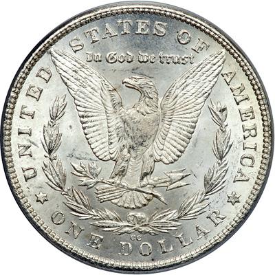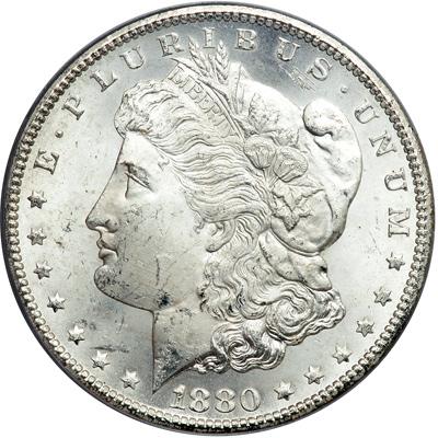 1880-CC Morgan Dollar. Reverse of 1879. PCGS graded MS-63. Principally untoned and very frosty. Struck with technical exactness throughout, the Carson City Mint produced high quality strikes in the 1880s, though slipped a notch with some of the 1890s-decade dates.GSA (PCGS # 7100) .