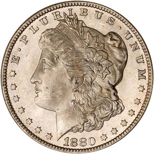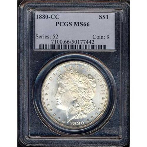 <b>1880-CC Morgan Dollar. Reverse of 1879. PCGS graded MS66.</b> The surfaces are untoned, oscillating with silvery color, and quite lustrous, as is the case with most 1880-CC dollars, the main reason these pieces are so actively collected. The devices, too, are outstanding, having been struck with such force and determination by the dies that all design elements show clearly <b>(PCGS # 7100)</b> <i>