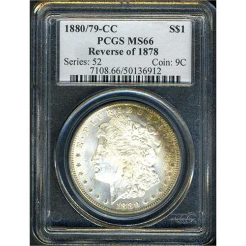 <b>1880/79-CC Morgan Dollar. Reverse of 1878. PCGS graded MS66.</b> Clear presence of both a 7 and 9 under the last two digits of the date. An example whose rich frosty white luster pulsates with an inner energy like atomic fission, a thin crescent of amber colored toning adds to the appeal. Struck with preciseness only now and then found, we are eager to see who lands this prize! We expect many hands in the air when bidding commences <b>(PCGS # 7108)</b>
