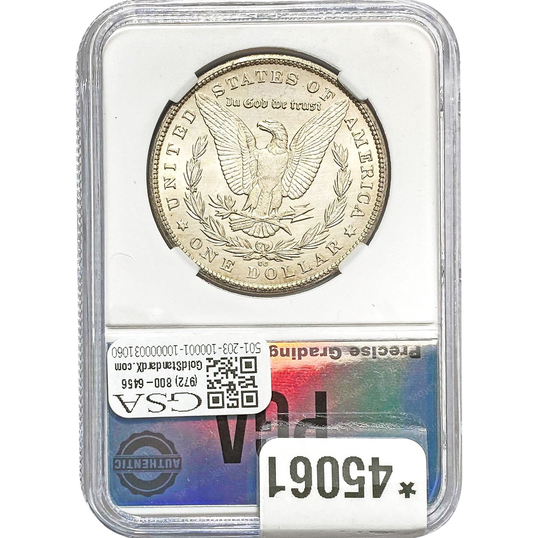 COINS AND CURRENCY LISTED IN GSA’S CATALOG AS GRADED AND ENCAPSULATED BY PCGS, NGC, ANACS, ICG, PCGS CURRENCY, PMG, PCGS BANKNOTE GRADING, CMC OR ANY OTHER THIRD-PARTY GRADING SERVICE ARE LIKEWISE SOLD “AS-IS” EXCEPT AS EXPRESSLY SET FORTH HEREIN. ALL THIRD-PARTY GRADING SERVICE GUARANTEES, INCLUDING AUTHENTICITY, ARE THE SOLE RESPONSIBILITY OF THE THIRD-PARTY GRADING SERVICE AND NOT WARRANTIES OR GUARANTEES OF GSA. BIDDERS SHOULD CONTACT THESE THIRD-PARTY GRADING SERVICES DIRECTLY WITH RESPECT TO ANY CLAIMS OR QUESTIONS THEY MAY HAVE CONCERNING THEIR GUARANTEES AND WARRANTIES. BIDDERS ACKNOWLEDGE AND AGREE THAT AUCTIONEER IS NOT BOUND BY OR LIABLE FOR ANY OPINION OR CERTIFICATION BY ANY THIRD-PARTY GRADING SERVICE. REMOVAL OF A PRODUCT FROM ITS PROTECTIVE CASING OR HOLDER OR ALTERATION OF ANY COIN HOLDER WAIVES ALL RIGHTS CONCERNING THE PRODUCT CONTAINED THEREIN.