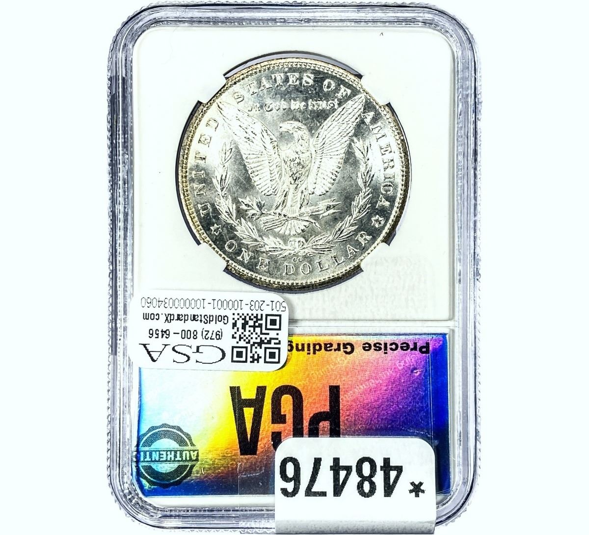 COINS AND CURRENCY LISTED IN GSA’S CATALOG AS GRADED AND ENCAPSULATED BY PCGS, NGC, ANACS, ICG, PCGS CURRENCY, PMG, PCGS BANKNOTE GRADING, CMC OR ANY OTHER THIRD-PARTY GRADING SERVICE ARE LIKEWISE SOLD “AS-IS” EXCEPT AS EXPRESSLY SET FORTH HEREIN. ALL THIRD-PARTY GRADING SERVICE GUARANTEES, INCLUDING AUTHENTICITY, ARE THE SOLE RESPONSIBILITY OF THE THIRD-PARTY GRADING SERVICE AND NOT WARRANTIES OR GUARANTEES OF GSA. BIDDERS SHOULD CONTACT THESE THIRD-PARTY GRADING SERVICES DIRECTLY WITH RESPECT TO ANY CLAIMS OR QUESTIONS THEY MAY HAVE CONCERNING THEIR GUARANTEES AND WARRANTIES. BIDDERS ACKNOWLEDGE AND AGREE THAT AUCTIONEER IS NOT BOUND BY OR LIABLE FOR ANY OPINION OR CERTIFICATION BY ANY THIRD-PARTY GRADING SERVICE. REMOVAL OF A PRODUCT FROM ITS PROTECTIVE CASING OR HOLDER OR ALTERATION OF ANY COIN HOLDER WAIVES ALL RIGHTS CONCERNING THE PRODUCT CONTAINED THEREIN.