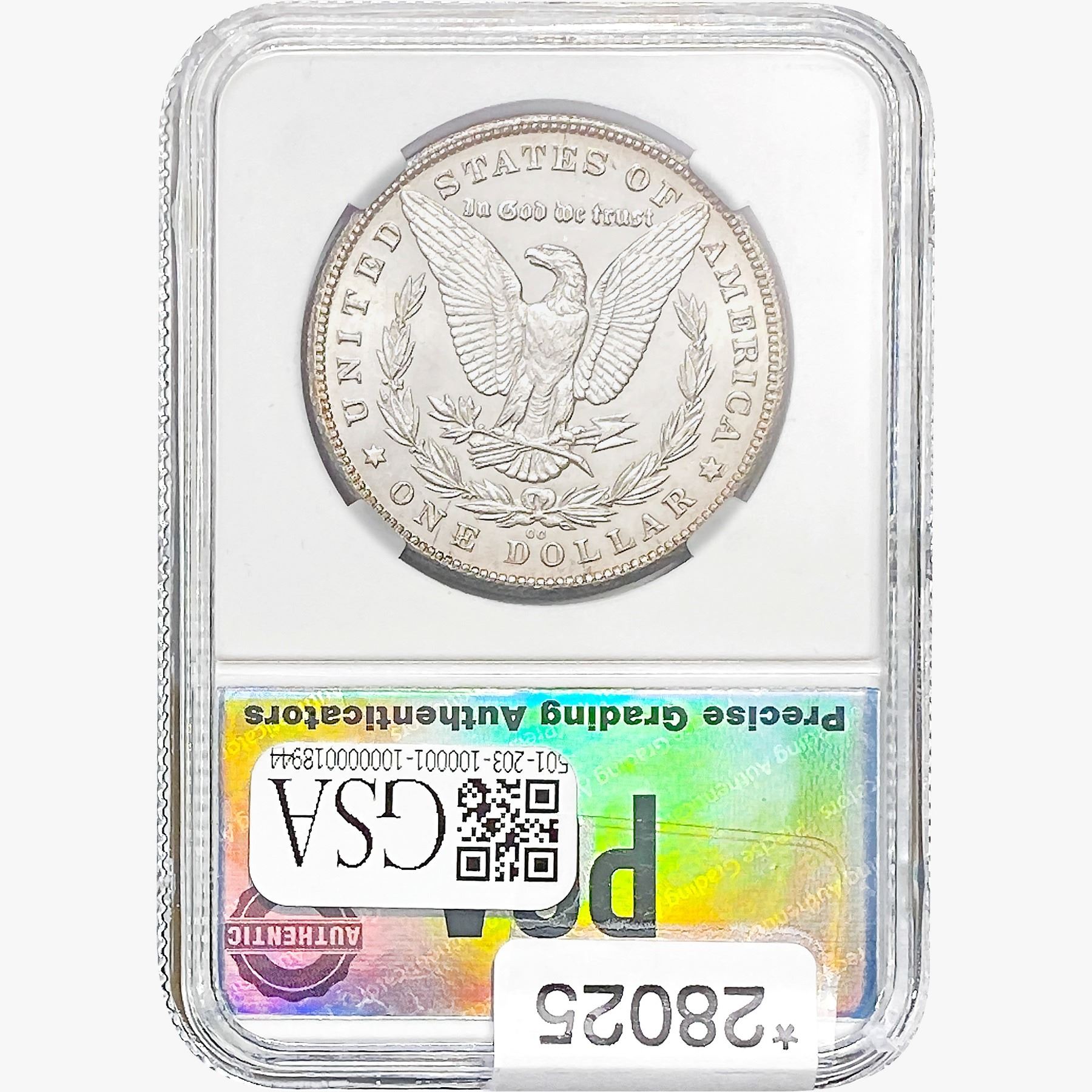 COINS AND CURRENCY LISTED IN GSA’S CATALOG AS GRADED AND ENCAPSULATED BY PCGS, NGC, ANACS, ICG, PCGS CURRENCY, PMG, PCGS BANKNOTE GRADING, CMC OR ANY OTHER THIRD-PARTY GRADING SERVICE ARE LIKEWISE SOLD “AS-IS” EXCEPT AS EXPRESSLY SET FORTH HEREIN. ALL THIRD-PARTY GRADING SERVICE GUARANTEES, INCLUDING AUTHENTICITY, ARE THE SOLE RESPONSIBILITY OF THE THIRD-PARTY GRADING SERVICE AND NOT WARRANTIES OR GUARANTEES OF GSA. BIDDERS SHOULD CONTACT THESE THIRD-PARTY GRADING SERVICES DIRECTLY WITH RESPECT TO ANY CLAIMS OR QUESTIONS THEY MAY HAVE CONCERNING THEIR GUARANTEES AND WARRANTIES. BIDDERS ACKNOWLEDGE AND AGREE THAT AUCTIONEER IS NOT BOUND BY OR LIABLE FOR ANY OPINION OR CERTIFICATION BY ANY THIRD-PARTY GRADING SERVICE. REMOVAL OF A PRODUCT FROM ITS PROTECTIVE CASING OR HOLDER OR ALTERATION OF ANY COIN HOLDER WAIVES ALL RIGHTS CONCERNING THE PRODUCT CONTAINED THEREIN.