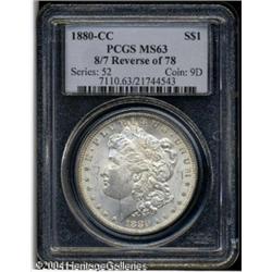 1880-CC S$1 8/7 Reverse of 1878 MS63 PCGS. VAM-7, <B>1880-CC S$1 8/7 Reverse of 1878 MS63 PCGS.</B></I> VAM-7, one of two Reverse of 1878 VAMs for the issue. Well struck, lustrous, and lightly toned aside from a glimpse of dark color on the reverse at 12 o'clock. <BR><BR><B>Important notice:</B> Heritage usually auctions material at the rate of 200-250 lots per hour. On some occasions eBay Live bid software or the Internet may not be able to keep up with the pace of the auction. We recommend placing a realistic absentee bid now as insurance to avoid disappointment. Occasionally the auctioneer may eliminate or reject an eBay Live bid, and the auctioneer may also reopen a lot after the close of the eBay live bidding (usually because we missed an audience bid), and may reject your bid even if it shows you as the winning bidder. By bidding via eBay Live, you agree that Heritage may award the lot to another bidder at its sole discretion under the circumstances described above or any other reasonable circumstances. Since eBay bids are not shown to us until we open the lot on the floor, we treat those bids just like floor bids. In most cases the floor responds before the eBay bid is presented to us, due to Internet lag time, so for consistency we have made it a policy that floor bids are always considered first over tie eBay live bids. Also please note that all Heritage lots purchased through eBay Live carry a 20% Buyer's Premium. Please make sure you read the Terms and Conditions before you bid. This lot is being auctioned in conjunction with a live floor auction by Heritage Galleries & Auctioneers. All final auction and invoice information will be supplied by Heritage Galleries & Auctioneers, and all other information should be considered preliminary. Lot:7352