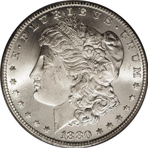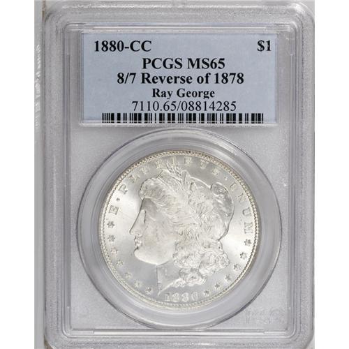 <B>1880-CC S$1 8/7 Reverse of 1878 MS65 PCGS.</B></I> Ex: Ray George. VAM-7. The remains of a previous 7 are visible beneath the first 8 in the date, while the Reverse of 1878 features the parallel top arrow feather on the eagle's breast. This radiant Gem offers exuberant luster over untoned surfaces, with considerable field-device contrast and excellent eye appeal. PCGS has graded 23 pieces finer (11/06).<BR><I>From The Cocoa Beach Collection.</B></I><BR><BR><b>Shipping:</b> Coin/Currency (<a target="_blank" href="http://www.heritageauctions.com/common/shipping.php">view shipping information</a>)