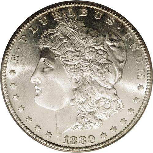 <B>1880-CC<img border='0' src='http://www.heritagecoins.com/images/star.gif' width=10 height=10>$1> 8 Over High 7 MS66 PCGS.</B></I> Ex: Wayne Miller Collection. VAM-5. A Top 100 Variety. <B>The plate coin in Wayne Miller's <I>Morgan and Peace Dollar Textbook.</B></I></B></I> The underdigit 7 is obvious within the second 8 in the date. The design elements on this Premium Gem are sharply impressed; virtually all of the strands of Liberty's hair over the ear are fully delineated. The fields are somewhat prooflike, and provide a mild contrast with the lightly frosted motifs. Speckles of orange color visit limited areas of the obverse border, while the remaining surfaces are untoned. A few minor luster grazes on Liberty's cheek and neck and in the reverse fields preclude an even higher grade. Population: 48 in 66, 5 finer (11/05).<BR><I>Ex: Goldberg's Long Beach Auction (9/2004), lot 984, where it brought $8,912.50.</B></I><BR><I>From The Michael Casper Collection, Part Three.</B></I>