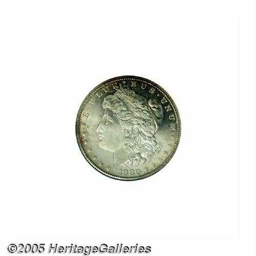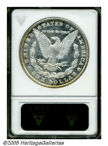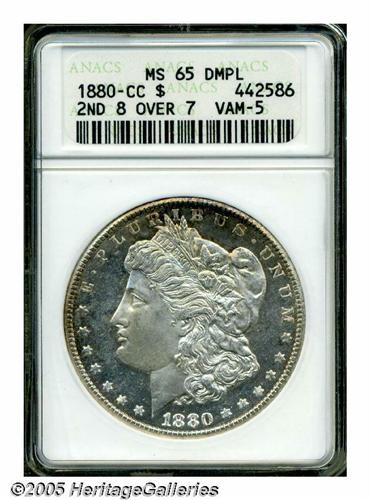 <B>1880-CC<S$1> 8 Over 7 MS65 Deep Mirror Prooflike ANACS.</B></I> VAM-5. A Top 100 Variety. Clear evidence of a previous 7 is visible high in the upper loop of the second 8. This is a nicely contrasted example with deep mirrored fields and lustrous devices. The surfaces are mostly brilliant with just a touch of rose and iridescent toning along the borders.