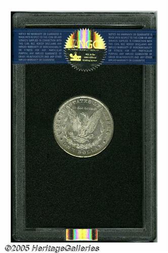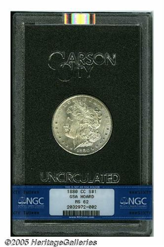 <B>1880-CC<S$1> 8 Over High 7 MS62 NGC.</B></I> VAM-5. A Top 100 Variety. Gentle gold color visits this sharply struck and lustrous GSA Dollar. The fields are beautifully preserved. Two separated slide marks on the lower cheek and near the mouth deny a finer grade.