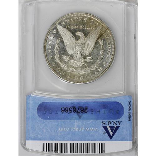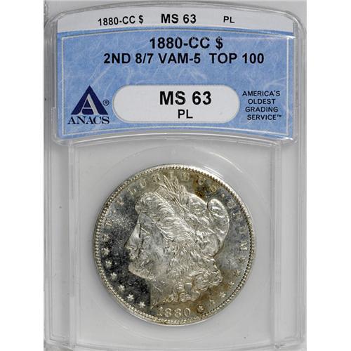 <B>1880-CC<img border='0' src='http://www.heritagecoins.com/images/star.gif' width=10 height=10>$1> 8 Over High 7 MS63 Prooflike ANACS.</B></I> VAM-5. A Top 100 Variety. The underdigit is plain with magnification. Patches of brown toning above the head and light, hazy toning appear on this moderately-mirrored Select coin.