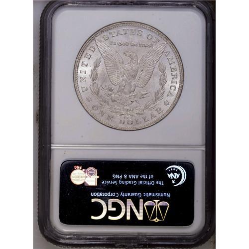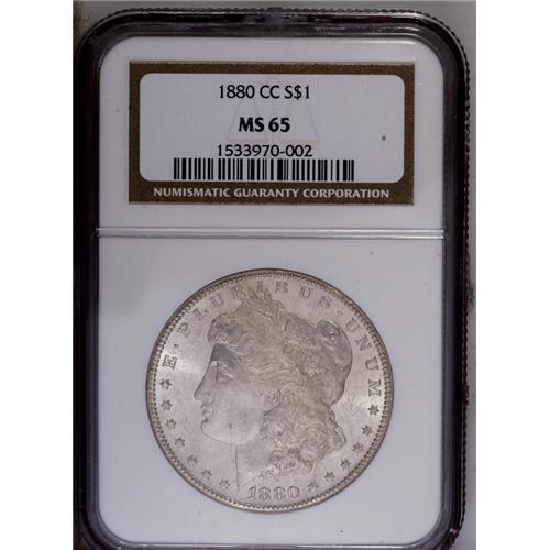 <B>1880-CC<img border='0' src='http://www.heritagecoins.com/images/star.gif' width=10 height=10>$1> 8 Over High 7 MS65 NGC.</B></I> VAM-5. A Top 100 Variety. Luster blasts through the dusky tan-gray toning. A penetratingly struck and lustrous Gem with lovely eye appeal. The overdate feature is undesignated on the NGC insert.