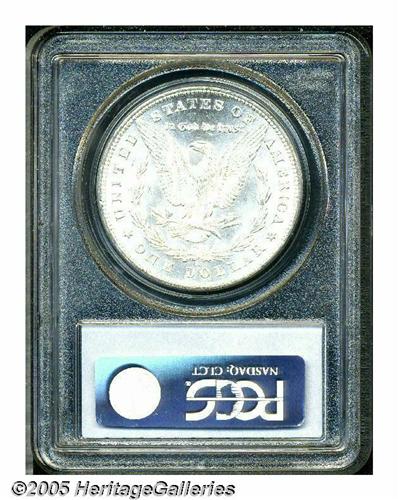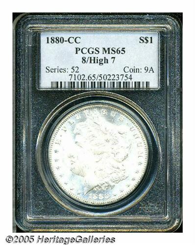 <B>1880-CC<S$1> 8 Over High 7 MS65 PCGS.</B></I> VAM-5. A Top 100 Variety. A pleasing representative of this popular and obvious overdate. Silvery surfaces display nice luster and sharply struck design elements. A few minor marks are noted on Liberty's face. Population: 135 in 65, 49 finer (6/05).