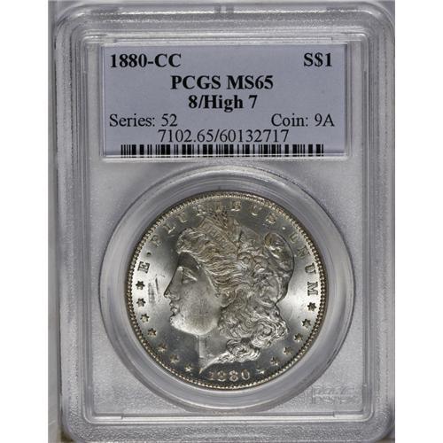<B>1880-CC<img border='0' src='http://www.heritagecoins.com/images/star.gif' width=10 height=10>$1> 8 Over High 7 MS65 PCGS.</B></I> VAM-5. A Top 100 Variety. The frosty devices are solidly struck for the issue, and the fields have attractive luster. Though scattered abrasions keep this coin from a higher grade, it has great eye appeal befitting the Gem it is.<BR><I>From The Chicago-Ark Collection.</B></I>