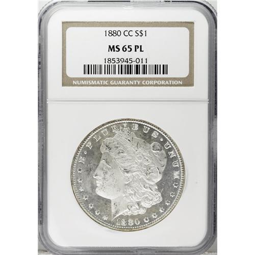 <B>1880-CC S$1 8 Over Low 7 MS65 Prooflike NGC.</B></I> VAM-6. A Top 100 Variety. An obvious underdigit 7 is seen within the second 8 in the date. This nicely mirrored Gem is well struck and has a frosty, snow-white appearance. Surface marks are not excessive.<BR><BR><b>Shipping:</b> Coins & Currency (<a target="_blank" href="http://www.heritageauctions.com/common/shipping.php">view shipping information</a>)