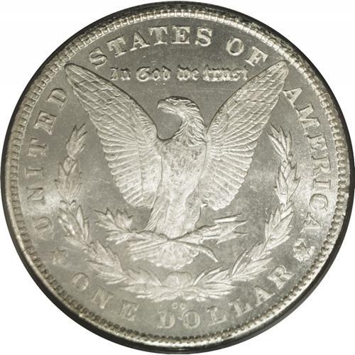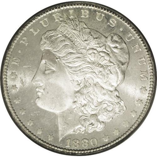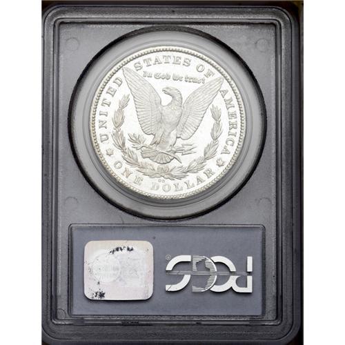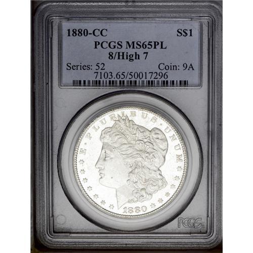 <B>1880-CC<img border='0' src='http://www.heritagecoins.com/images/star.gif' width=10 height=10>$1> 8 Over High 7 MS65 Prooflike PCGS.</B></I> VAM-5. A Top 100 Variety. The underdigit 7 is clearly visible beneath the second 8 in the date. Bowers' Morgan dollar <I>Guide Book</B></I> comments of this issue that prooflike coins are apt to be lightly struck at the centers, and that is the case with this brilliant Gem coin. The strike is also deficient on the eagle's right (facing) leg. However, the pristine fields, frosted devices, and overall huge eye appeal more than compensate. The few light abrasions that can be seen with a loupe are consistent with the grade. Overall, an exceedingly attractive example of this popular VAM variety. PCGS has graded nine examples of this issue in Prooflike, with none finer in that designation (3/06). <BR><BR><B>Important notice:</B> Heritage usually auctions material at the rate of 200-250 lots per hour. On some occasions eBay Live bid software or the Internet may not be able to keep up with the pace of the auction. We recommend placing a realistic absentee bid now as insurance to avoid disappointment. Occasionally the auctioneer may eliminate or reject an eBay Live bid, and the auctioneer may also reopen a lot after the close of the eBay live bidding (usually because we missed an audience bid), and may reject your bid even if it shows you as the winning bidder. By bidding via eBay Live, you agree that Heritage may award the lot to another bidder at its sole discretion under the circumstances described above or any other reasonable circumstances. Since eBay bids are not shown to us until we open the lot on the floor, we treat those bids just like floor bids. In most cases the floor responds before the eBay bid is presented to us, due to Internet lag time, so for consistency we have made it a policy that floor bids are always considered first over tie eBay live bids. Also please note that all Heritage lots purchased through eBay Live carry a 20% Buyer's Premium. Please make sure you read the Terms and Conditions before you bid. This lot is being auctioned in conjunction with a live floor auction by Heritage Galleries & Auctioneers. All final auction and invoice information will be supplied by Heritage Galleries & Auctioneers, and all other information should be considered preliminary. Lot:3274 <BR><BR><B>Winning Notification and Billing:</B> After the FINAL session in this auction is complete, Heritage will send e-mail and snail mail invoices. This process normally takes several days. All final auction and invoice information will be supplied by Heritage Galleries & Auctioneers, and all other information should be considered preliminary. <BR><BR>This auction will be conducted on a live auction floor and over the Internet through eBay Live. If you choose to place an absentee bid, please take a moment to <font color='#0000ff'><u><a href='http://pages.ebay.com/liveauctions/help/before/laabsentee.html'>learn how eBay Live absentee bidding works</a></u></font><font color='#000000'>
