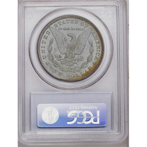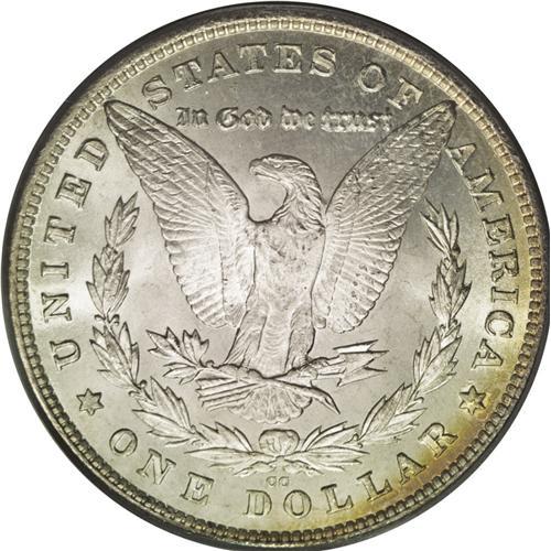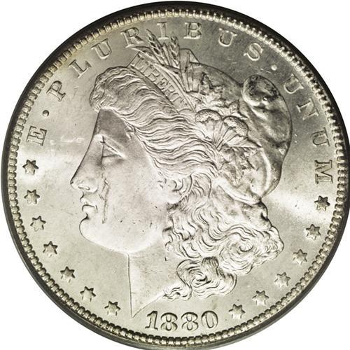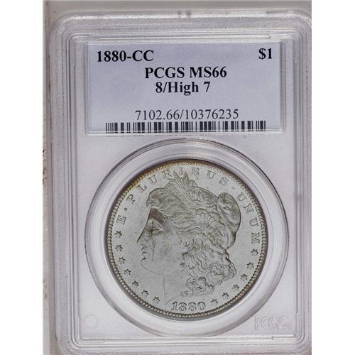 <B>1880-CC<img border='0' src='http://www.heritagecoins.com/images/star.gif' width=10 height=10>$1> 8 Over High 7 MS66 PCGS.</B></I> VAM-5. A Top 100 Variety. Clear details of the former 7 are visible in both loops of the second 8 in the date. A crescent of light golden-tan color adheres to the right reverse border. The design elements are sharply impressed, with nice definition apparent in the hair overlying Liberty's ear. Lustrous surfaces are well preserved, exhibiting just a few minute marks on Liberty's cheek and neck. Population: 56 in 66, 5 finer (5/06).