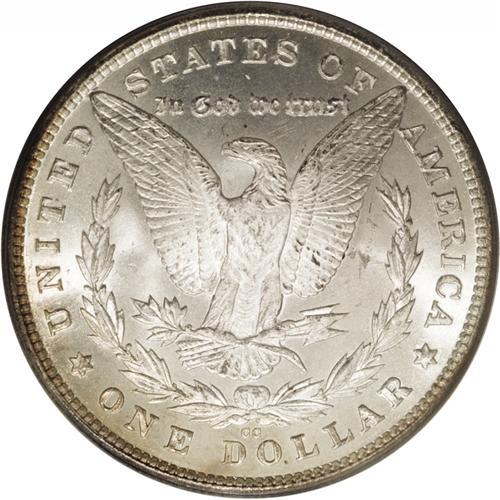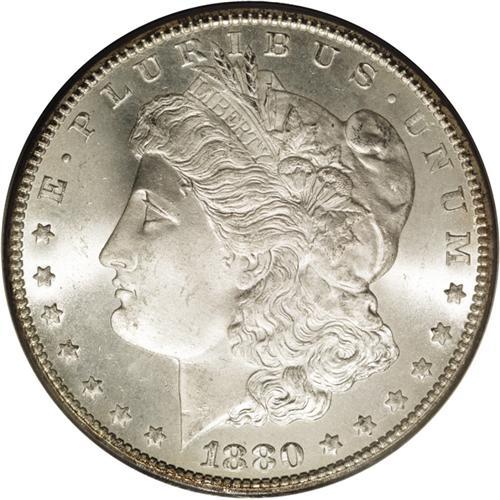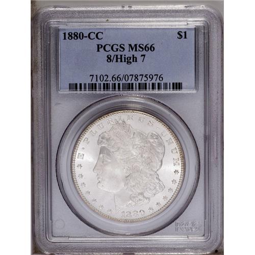 <B>1880-CC<img border='0' src='http://www.heritagecoins.com/images/star.gif' width=10 height=10>$1> 8 Over High 7 MS66 PCGS.</B></I> VAM-5. A Top 100 Variety. The underdigit 7 is obvious within the second 8 in the date. The silver-gray surfaces display some prooflike tendencies, and show whispers of golden-gray patina, especially around the reverse periphery. The design elements are well brought up, though some minor softness is apparent in the hair over Liberty's ear. A few light luster grazes are seen on Liberty's cheek and neck. Population: 51 in 66, 5 finer (3/06). <BR><BR><B>Important notice:</B> Heritage usually auctions material at the rate of 200-250 lots per hour. On some occasions eBay Live bid software or the Internet may not be able to keep up with the pace of the auction. We recommend placing a realistic absentee bid now as insurance to avoid disappointment. Occasionally the auctioneer may eliminate or reject an eBay Live bid, and the auctioneer may also reopen a lot after the close of the eBay live bidding (usually because we missed an audience bid), and may reject your bid even if it shows you as the winning bidder. By bidding via eBay Live, you agree that Heritage may award the lot to another bidder at its sole discretion under the circumstances described above or any other reasonable circumstances. Since eBay bids are not shown to us until we open the lot on the floor, we treat those bids just like floor bids. In most cases the floor responds before the eBay bid is presented to us, due to Internet lag time, so for consistency we have made it a policy that floor bids are always considered first over tie eBay live bids. Also please note that all Heritage lots purchased through eBay Live carry a 20% Buyer's Premium. Please make sure you read the Terms and Conditions before you bid. This lot is being auctioned in conjunction with a live floor auction by Heritage Galleries & Auctioneers. All final auction and invoice information will be supplied by Heritage Galleries & Auctioneers, and all other information should be considered preliminary. Lot:3273 <BR><BR><B>Winning Notification and Billing:</B> After the FINAL session in this auction is complete, Heritage will send e-mail and snail mail invoices. This process normally takes several days. All final auction and invoice information will be supplied by Heritage Galleries & Auctioneers, and all other information should be considered preliminary. <BR><BR>This auction will be conducted on a live auction floor and over the Internet through eBay Live. If you choose to place an absentee bid, please take a moment to <font color='#0000ff'><u><a href='http://pages.ebay.com/liveauctions/help/before/laabsentee.html'>learn how eBay Live absentee bidding works</a></u></font><font color='#000000'>