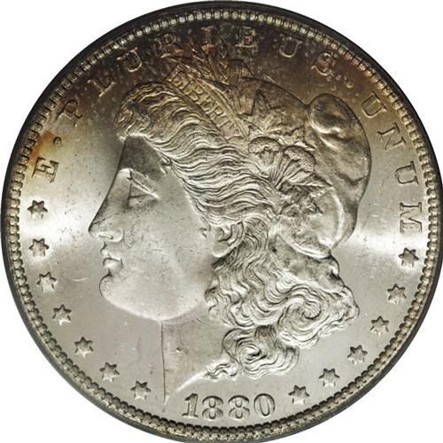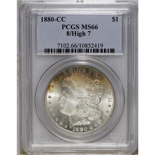 <B>1880-CC S$1 8 Over High 7 MS66 PCGS.</B></I> VAM-5. A Top 100 Variety. The underdigit 7 is all too obvious, although curiously, no evidence of an underdigit 9 is present. This well struck and flashy Premium Gem has lovely orange, plum, and sea-green toning across the upper obverse margin. Population: 55 in 66, 5 finer (10/06).<BR><BR><b>Shipping:</b> Coin/Currency (<a target="_blank" href="http://www.heritageauctions.com/common/shipping.php">view shipping information</a>)
