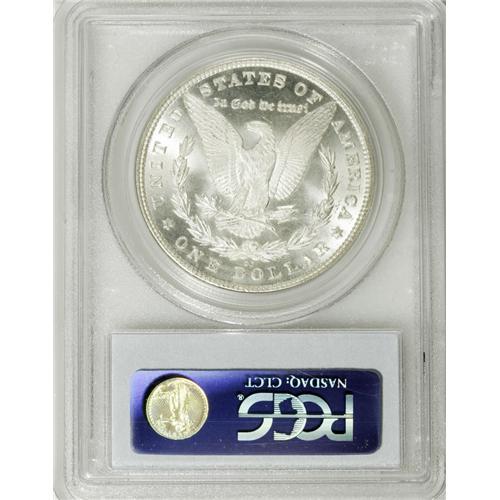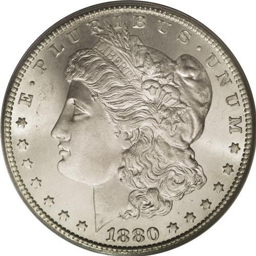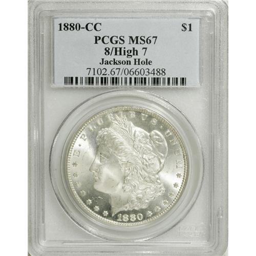<B>1880-CC S$1 8 Over High 7 MS67 PCGS.</B></I> Ex: Jackson Hole. VAM-5. A Top 100 Variety. Nearly an entire 7 is visible under the second 8 in the date. While many 1880-CC dollars have a small dash under the 8, only VAM-4, 5, and 6 have most of the former 7 visible inside the 8. These three varieties are clearly the most desirable of the overdates. This piece is an exceptional Superb Gem with frosty silver luster and fully brilliant white surfaces. PCGS has certified five examples of this variety at the MS67 grade level, in addition to 24 examples that are unidentified by variety. None have been graded finer.<BR><I>From The Jackson Hole Collection.</B></I><BR><BR><b>Shipping:</b> Coins & Currency (<a target="_blank" href="http://www.heritageauctions.com/common/shipping.php">view shipping information</a>)